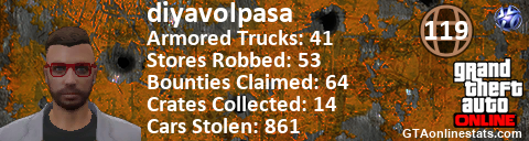[URL=http://GTAonlinestats.com/showplayer/diyavolpasa][IMG]http://GTAonlinestats.com/randomsignature/diyavolpasa/sig.png[/IMG][/URL]