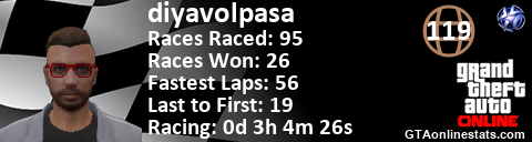 [URL=http://GTAonlinestats.com/showplayer/diyavolpasa][IMG]http://GTAonlinestats.com/racesignature/diyavolpasa/sig.png[/IMG][/URL]