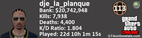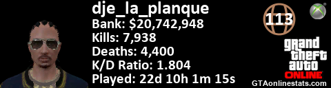 <a href="http://GTAonlinestats.com/showplayer/dje_la_planque"><img src="http://GTAonlinestats.com/randomsignature/dje_la_planque/sig.png" alt="dje_la_planque" border="0" /></a>