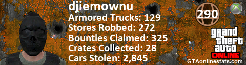 [URL=http://GTAonlinestats.com/showplayer/djiemownu][IMG]http://GTAonlinestats.com/randomsignature/djiemownu/sig.png[/IMG][/URL]