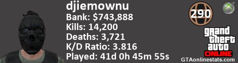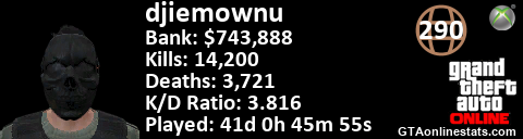[URL=http://GTAonlinestats.com/showplayer/djiemownu][IMG]http://GTAonlinestats.com/signature/djiemownu/sig.png[/IMG][/URL]