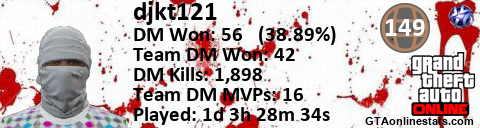[URL=http://GTAonlinestats.com/showplayer/djkt121][IMG]http://GTAonlinestats.com/signature/djkt121/sig.png[/IMG][/URL]