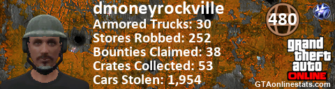 [URL=http://GTAonlinestats.com/showplayer/dmoneyrockville][IMG]http://GTAonlinestats.com/dmsignature/dmoneyrockville/sig.png[/IMG][/URL]