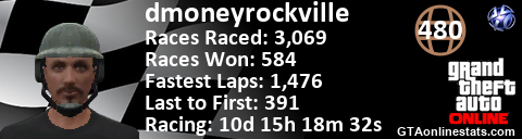 [URL=http://GTAonlinestats.com/showplayer/dmoneyrockville][IMG]http://GTAonlinestats.com/racesignature/dmoneyrockville/sig.png[/IMG][/URL]