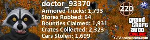[URL=http://GTAonlinestats.com/showplayer/doctor_93370][IMG]http://GTAonlinestats.com/randomsignature/doctor_93370/sig.png[/IMG][/URL]