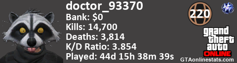 <a href="http://GTAonlinestats.com/showplayer/doctor_93370"><img src="http://GTAonlinestats.com/signature/doctor_93370/sig.png" alt="doctor_93370" border="0" /></a>