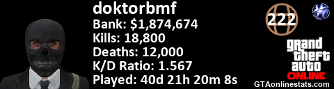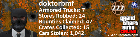 <a href="http://GTAonlinestats.com/showplayer/doktorbmf"><img src="http://GTAonlinestats.com/randomsignature/doktorbmf/sig.png" alt="doktorbmf" border="0" /></a>