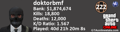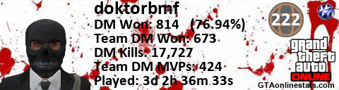 <a href="http://GTAonlinestats.com/showplayer/doktorbmf"><img src="http://GTAonlinestats.com/signature/doktorbmf/sig.png" alt="doktorbmf" border="0" /></a>
