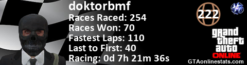 <a href="http://GTAonlinestats.com/showplayer/doktorbmf"><img src="http://GTAonlinestats.com/racesignature/doktorbmf/sig.png" alt="doktorbmf" border="0" /></a>
