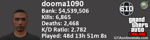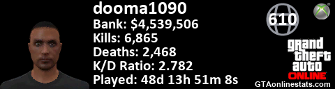 <a href="http://GTAonlinestats.com/showplayer/dooma1090"><img src="http://GTAonlinestats.com/dmsignature/dooma1090/sig.png" alt="dooma1090" border="0" /></a>