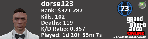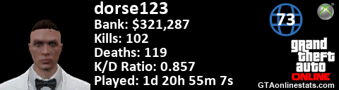 <a href="http://GTAonlinestats.com/showplayer/dorse123"><img src="http://GTAonlinestats.com/signature/dorse123/sig.png" alt="Dorse123" border="0" /></a>