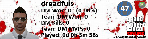 <a href="http://GTAonlinestats.com/showplayer/dreadfuis"><img src="http://GTAonlinestats.com/dmsignature/dreadfuis/sig.png" alt="DreadfuIs" border="0" /></a>