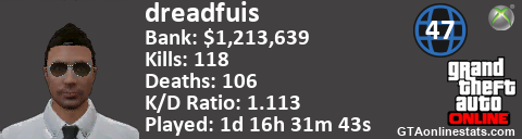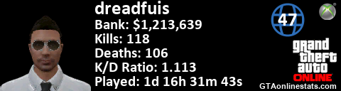 <a href="http://GTAonlinestats.com/showplayer/dreadfuis"><img src="http://GTAonlinestats.com/signature/dreadfuis/sig.png" alt="DreadfuIs" border="0" /></a>