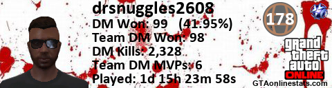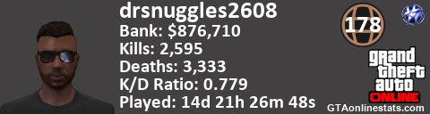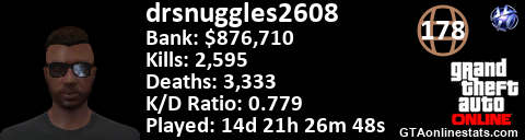 <a href="http://GTAonlinestats.com/showplayer/drsnuggles2608"><img src="http://GTAonlinestats.com/dmsignature/drsnuggles2608/sig.png" alt="DrSnuggles2608" border="0" /></a>