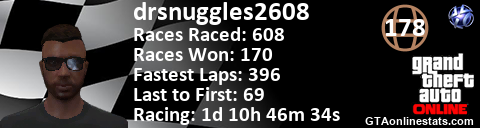 <a href="http://GTAonlinestats.com/showplayer/drsnuggles2608"><img src="http://GTAonlinestats.com/racesignature/drsnuggles2608/sig.png" alt="DrSnuggles2608" border="0" /></a>