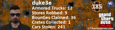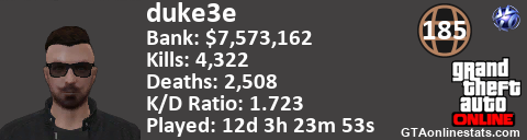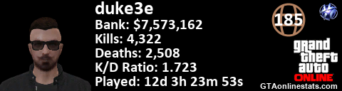 [URL=http://GTAonlinestats.com/showplayer/duke3e][IMG]http://GTAonlinestats.com/greysignature/duke3e/sig.png[/IMG][/URL]