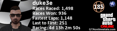 [URL=http://GTAonlinestats.com/showplayer/duke3e][IMG]http://GTAonlinestats.com/racesignature/duke3e/sig.png[/IMG][/URL]