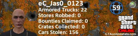 [URL=http://GTAonlinestats.com/showplayer/eC_Jas0_0123/3][IMG]http://GTAonlinestats.com/crimesignature/eC_Jas0_0123/3/sig.png[/IMG][/URL]