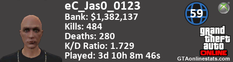 <a href="http://GTAonlinestats.com/showplayer/eC_Jas0_0123/3"><img src="http://GTAonlinestats.com/signature/eC_Jas0_0123/3/sig.png" alt="eC_Jas0_0123" border="0" /></a>