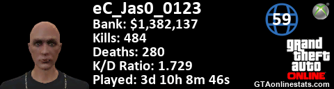 <a href="http://GTAonlinestats.com/showplayer/eC_Jas0_0123/3"><img src="http://GTAonlinestats.com/dmsignature/eC_Jas0_0123/3/sig.png" alt="eC_Jas0_0123" border="0" /></a>