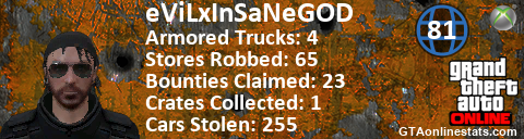 [URL=http://GTAonlinestats.com/showplayer/eViLxInSaNeGOD][IMG]http://GTAonlinestats.com/randomsignature/eViLxInSaNeGOD/sig.png[/IMG][/URL]