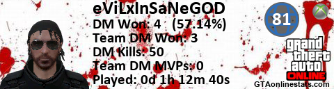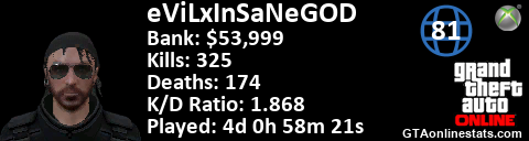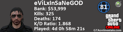 [URL=http://GTAonlinestats.com/showplayer/eViLxInSaNeGOD][IMG]http://GTAonlinestats.com/signature/eViLxInSaNeGOD/sig.png[/IMG][/URL]