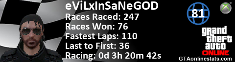 [URL=http://GTAonlinestats.com/showplayer/eViLxInSaNeGOD][IMG]http://GTAonlinestats.com/racesignature/eViLxInSaNeGOD/sig.png[/IMG][/URL]
