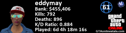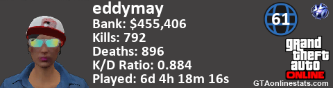 <a href="http://GTAonlinestats.com/showplayer/eddymay"><img src="http://GTAonlinestats.com/signature/eddymay/sig.png" alt="eddymay" border="0" /></a>