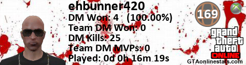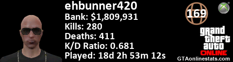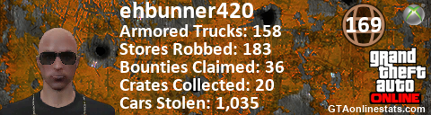 [URL=http://GTAonlinestats.com/showplayer/ehbunner420][IMG]http://GTAonlinestats.com/signature/ehbunner420/sig.png[/IMG][/URL]