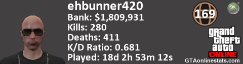 <a href="http://GTAonlinestats.com/showplayer/ehbunner420"><img src="http://GTAonlinestats.com/dmsignature/ehbunner420/sig.png" alt="ehbunner420" border="0" /></a>