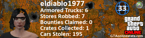 [URL=http://GTAonlinestats.com/showplayer/eldiablo1977/2][IMG]http://GTAonlinestats.com/crimesignature/eldiablo1977/2/sig.png[/IMG][/URL]