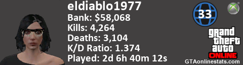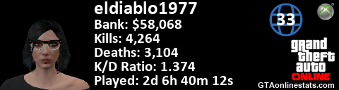 <a href="http://GTAonlinestats.com/showplayer/eldiablo1977/2"><img src="http://GTAonlinestats.com/dmsignature/eldiablo1977/2/sig.png" alt="eldiablo1977" border="0" /></a>