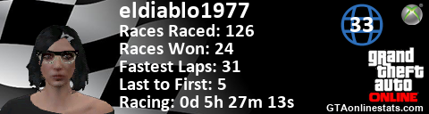 <a href="http://GTAonlinestats.com/showplayer/eldiablo1977/2"><img src="http://GTAonlinestats.com/racesignature/eldiablo1977/2/sig.png" alt="eldiablo1977" border="0" /></a>