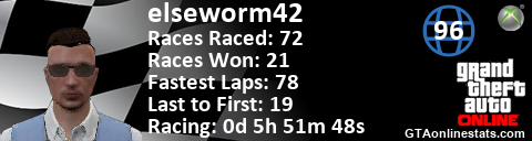 <a href="http://GTAonlinestats.com/showplayer/elseworm42"><img src="http://GTAonlinestats.com/racesignature/elseworm42/sig.png" alt="elseworm42" border="0" /></a>