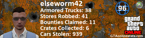 [URL=http://GTAonlinestats.com/showplayer/elseworm42][IMG]http://GTAonlinestats.com/crimesignature/elseworm42/sig.png[/IMG][/URL]