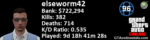<a href="http://GTAonlinestats.com/showplayer/elseworm42"><img src="http://GTAonlinestats.com/signature/elseworm42/sig.png" alt="elseworm42" border="0" /></a>