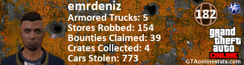 [URL=http://GTAonlinestats.com/showplayer/emrdeniz][IMG]http://GTAonlinestats.com/crimesignature/emrdeniz/sig.png[/IMG][/URL]