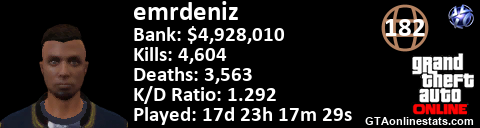 [URL=http://GTAonlinestats.com/showplayer/emrdeniz][IMG]http://GTAonlinestats.com/signature/emrdeniz/sig.png[/IMG][/URL]