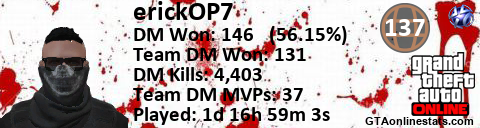 [URL=http://GTAonlinestats.com/showplayer/erickOP7][IMG]http://GTAonlinestats.com/dmsignature/erickOP7/sig.png[/IMG][/URL]