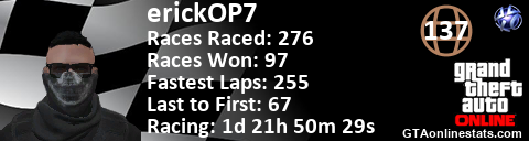 [URL=http://GTAonlinestats.com/showplayer/erickOP7][IMG]http://GTAonlinestats.com/racesignature/erickOP7/sig.png[/IMG][/URL]