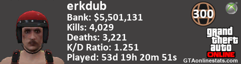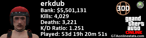 [URL=http://GTAonlinestats.com/showplayer/erkdub][IMG]http://GTAonlinestats.com/randomsignature/erkdub/sig.png[/IMG][/URL]