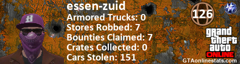 [URL=http://GTAonlinestats.com/showplayer/essen-zuid][IMG]http://GTAonlinestats.com/crimesignature/essen-zuid/sig.png[/IMG][/URL]