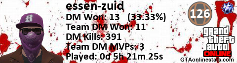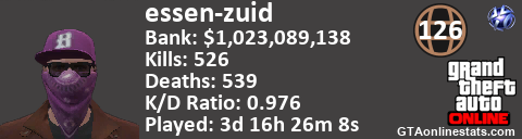 [URL=http://GTAonlinestats.com/showplayer/essen-zuid][IMG]http://GTAonlinestats.com/signature/essen-zuid/sig.png[/IMG][/URL]