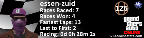 [URL=http://GTAonlinestats.com/showplayer/essen-zuid][IMG]http://GTAonlinestats.com/racesignature/essen-zuid/sig.png[/IMG][/URL]