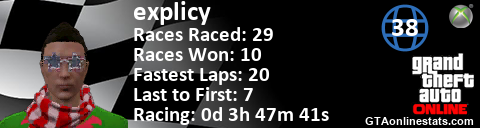 [URL=http://GTAonlinestats.com/showplayer/explicy][IMG]http://GTAonlinestats.com/racesignature/explicy/sig.png[/IMG][/URL]