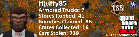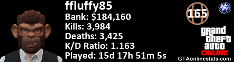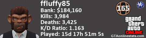 [URL=http://GTAonlinestats.com/showplayer/ffluffy85][IMG]http://GTAonlinestats.com/signature/ffluffy85/sig.png[/IMG][/URL]