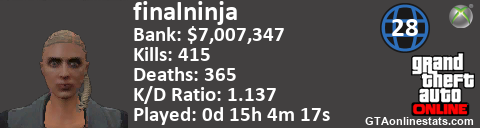 <a href="http://GTAonlinestats.com/showplayer/finalninja/2"><img src="http://GTAonlinestats.com/randomsignature/finalninja/2/sig.png" alt="finalninja" border="0" /></a>