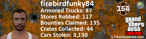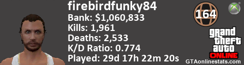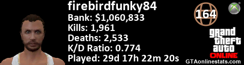 [URL=http://GTAonlinestats.com/showplayer/firebirdfunky84][IMG]http://GTAonlinestats.com/signature/firebirdfunky84/sig.png[/IMG][/URL]
