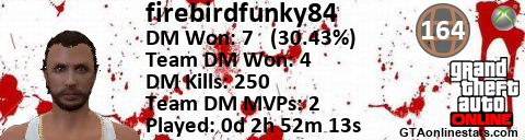 <a href="http://GTAonlinestats.com/showplayer/firebirdfunky84"><img src="http://GTAonlinestats.com/dmsignature/firebirdfunky84/sig.png" alt="FirebirdFunky84" border="0" /></a>