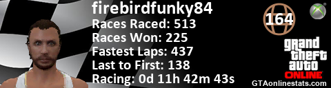 [URL=http://GTAonlinestats.com/showplayer/firebirdfunky84][IMG]http://GTAonlinestats.com/racesignature/firebirdfunky84/sig.png[/IMG][/URL]